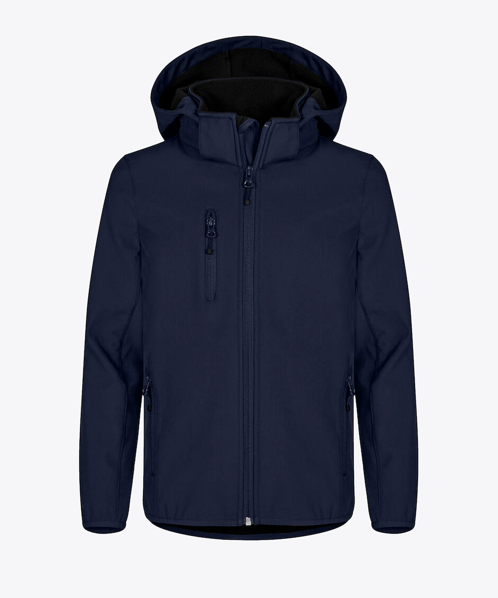 Unsere 3-lagige Kapuzen-Softshell-Jacke aus recyceltem Polyester. Ton-in-Ton umgekehrter Reißverschluss