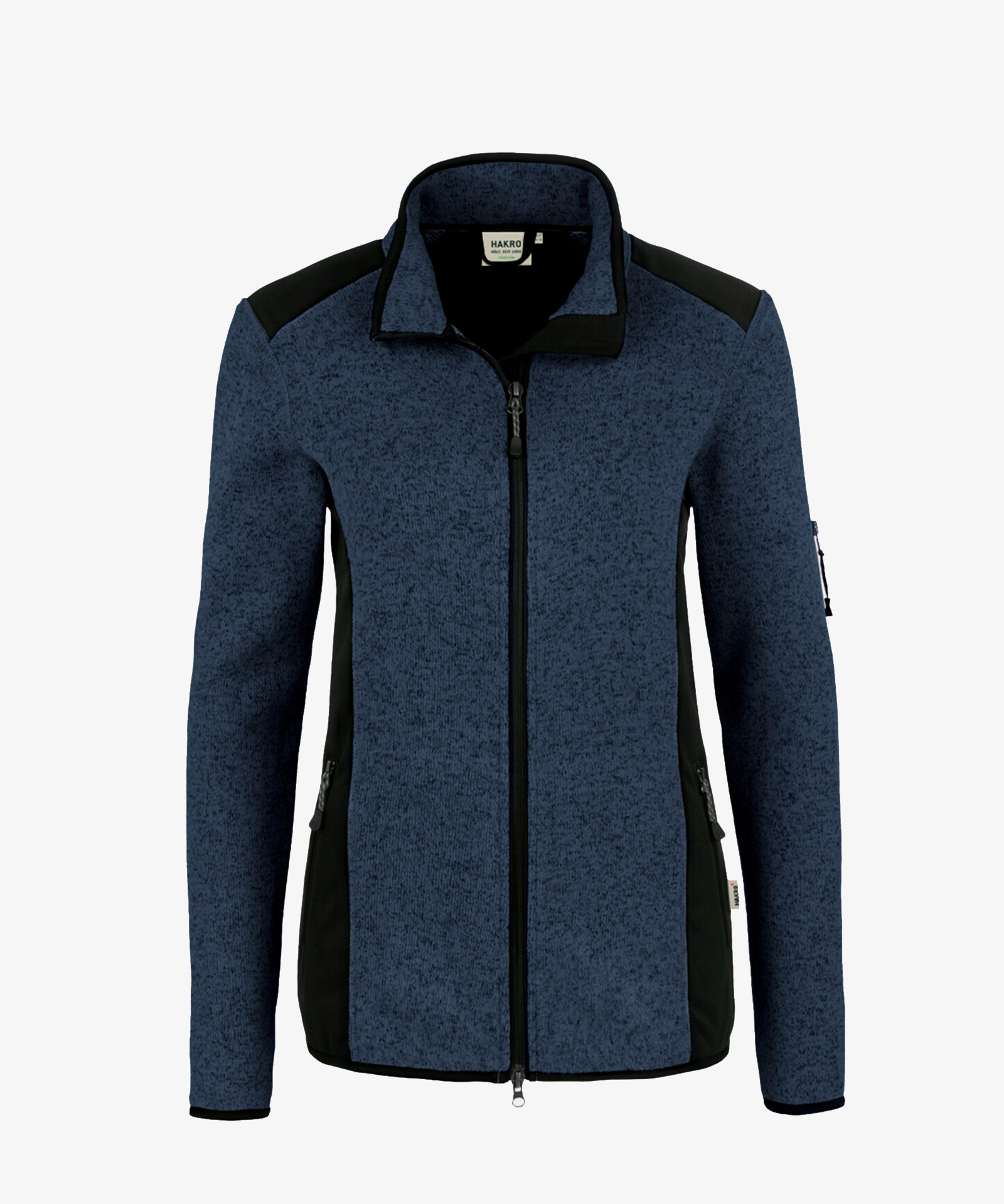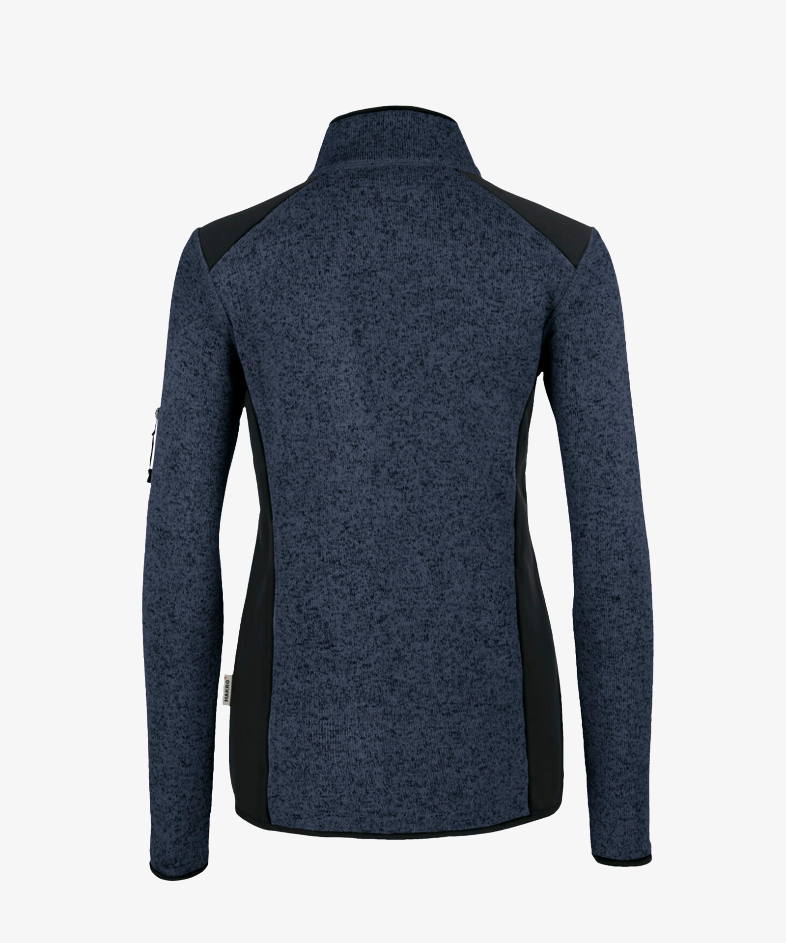 Strickfleecejacke mit Softshell-Einsätzen an den Seiten und Schultern in Kontrastfarbe Schwarz. Teilungsnähte auf Vorder und Rückenteil. Elastische Saum- und Ärmelbündchen, Nackenband und Aufhängeband. Hochwertiger 2-Wege-Frontreißverschluss, seitliche Reißverschlusstasche und Reißverschluss Ärmeltasche am linken Ärmel. Alle Reißverschlüsse von YKK® in Kontrastfarbe Schwarz und mit reversiblen, reflektierenden