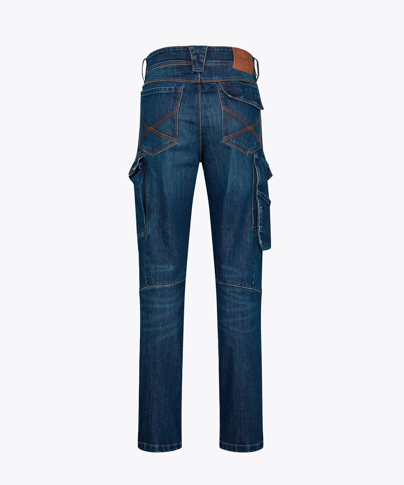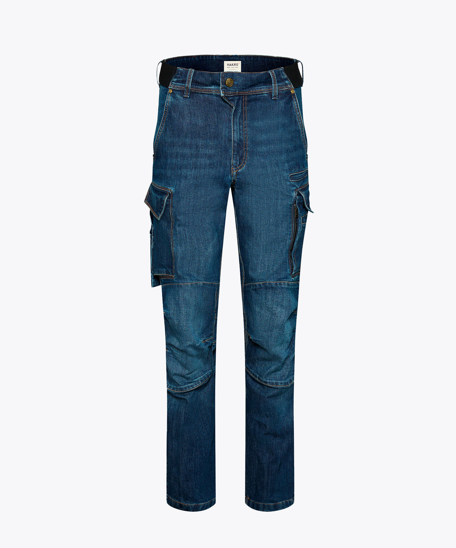 Extrem strapazierfähige Worker-Jeanshose mit dehnbarem Hosenbund durch robuste Strickeinsätze an den Seiten. Gürtelschlaufen, Hosenknopf und Reißverschluss. Patch am hinteren Bund und ergonomisch vorgeformte Passform. Zwei Einschubtaschen, rechts mit zusätzlicher Sicherheits-Reißverschlusstasche. Zwei Gesäßtaschen mit Stickerei, rechts mit Patte und Klettverschluss. Zwei Cargotaschen mit multifunktionellen Unterteilungen, verschließbar mit Patten und Reißverschlüssen. Aufgesetzte Zollstocktasche auf der rechten Seite. Knöpfe und Nieten mit HAKRO Schriftzug. Alle Reißverschlüsse von YKK®. Extrem strapazierfähiger bio-circular Dyneema®-Denim. Normale Passform: Regular Fit.