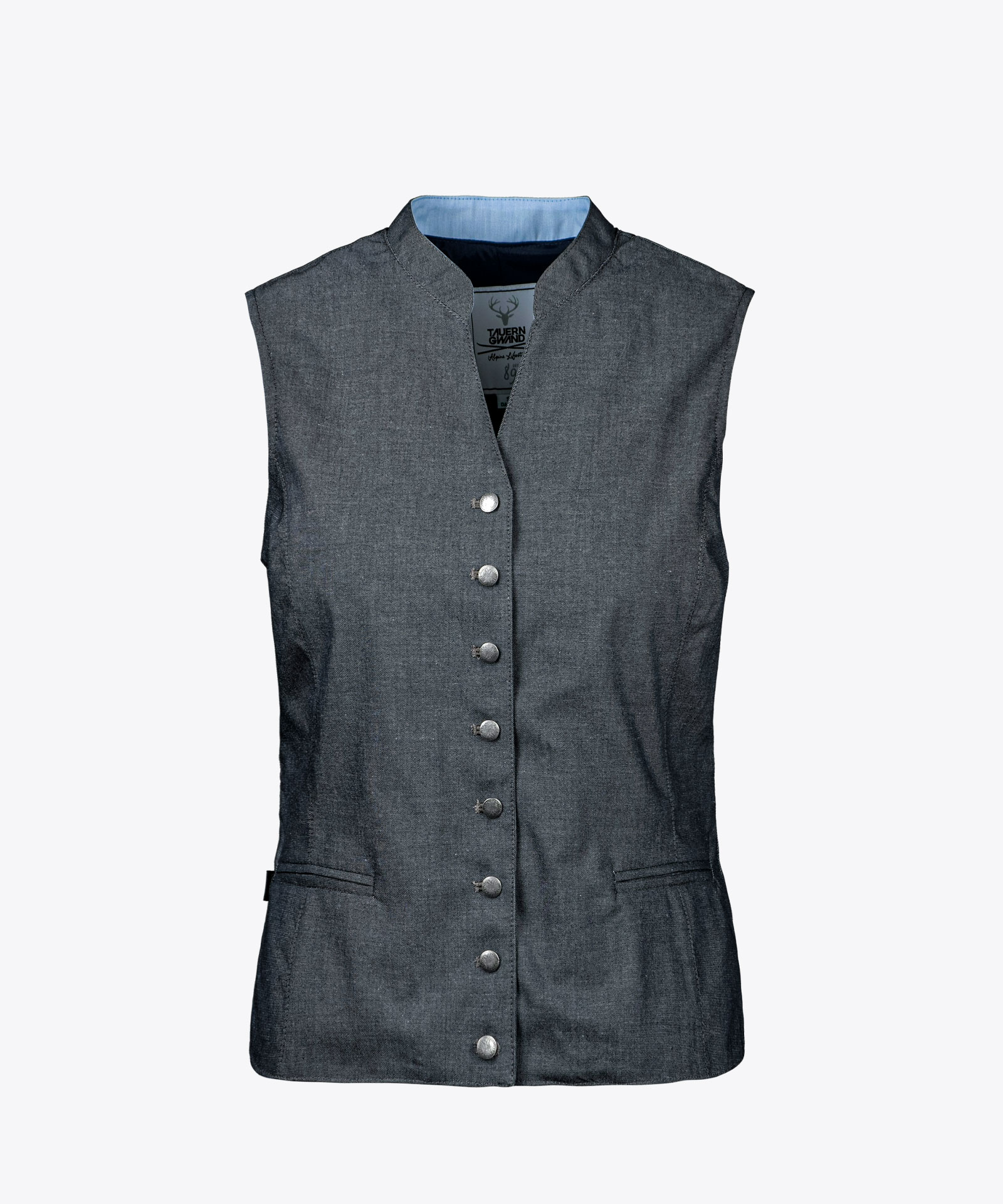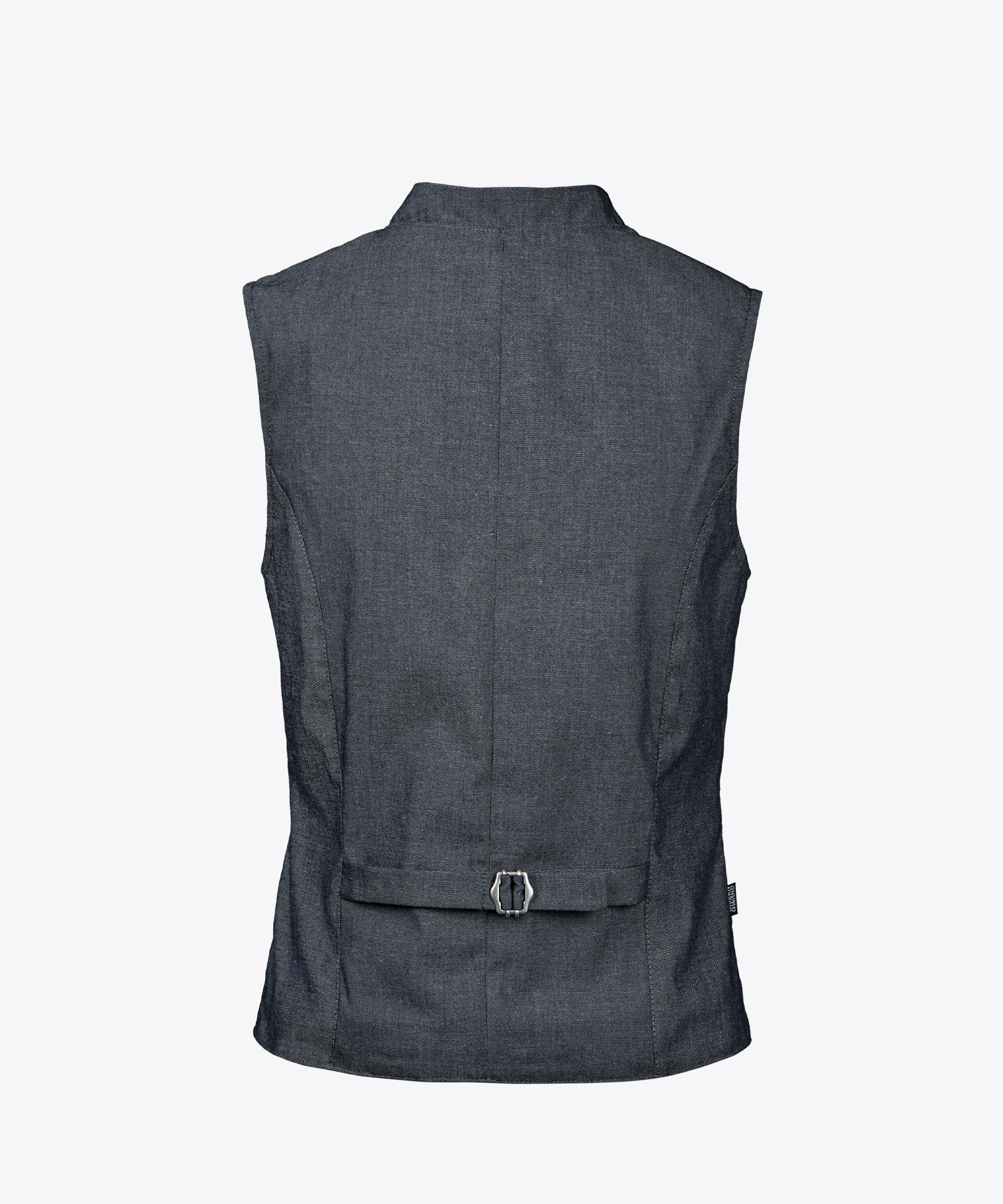 Hochgeschlossenes Westenmodell in fein melierter, pflegeleichter Stoffqualität; Rückenteil in Hauptmaterial mit verstellbarem Rückenriegel; kleiner Stehkragen mit Kontraststoff innen; Metallknöpfe; Paspeltaschen; gefüttert