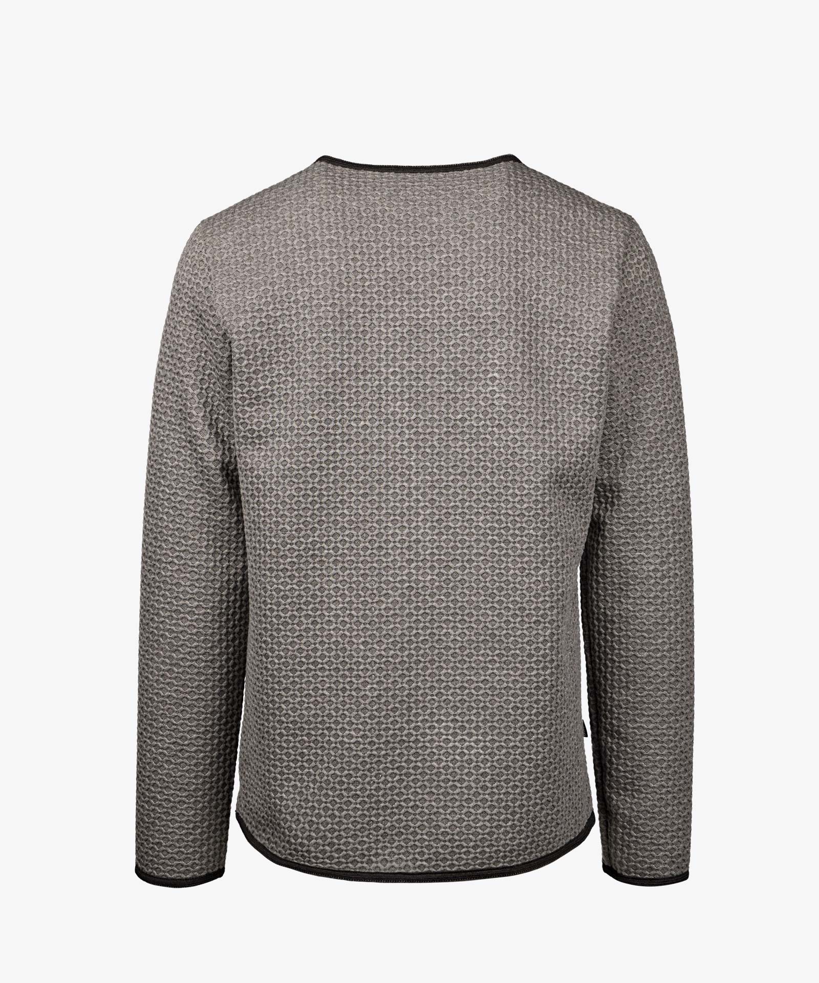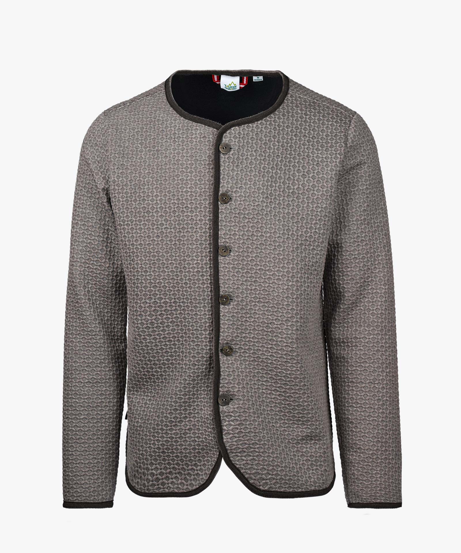 Traditionelle Strickjankeroptik aus unserer Tauerntex-Multilayer-Technologie, Außenseite in 3D-Rautenstrickmuster in Braun-Melange; Innenseite mit Jerseystoff gebondet; Knöpfe in Horn-Optik; Wollbandeinfassung