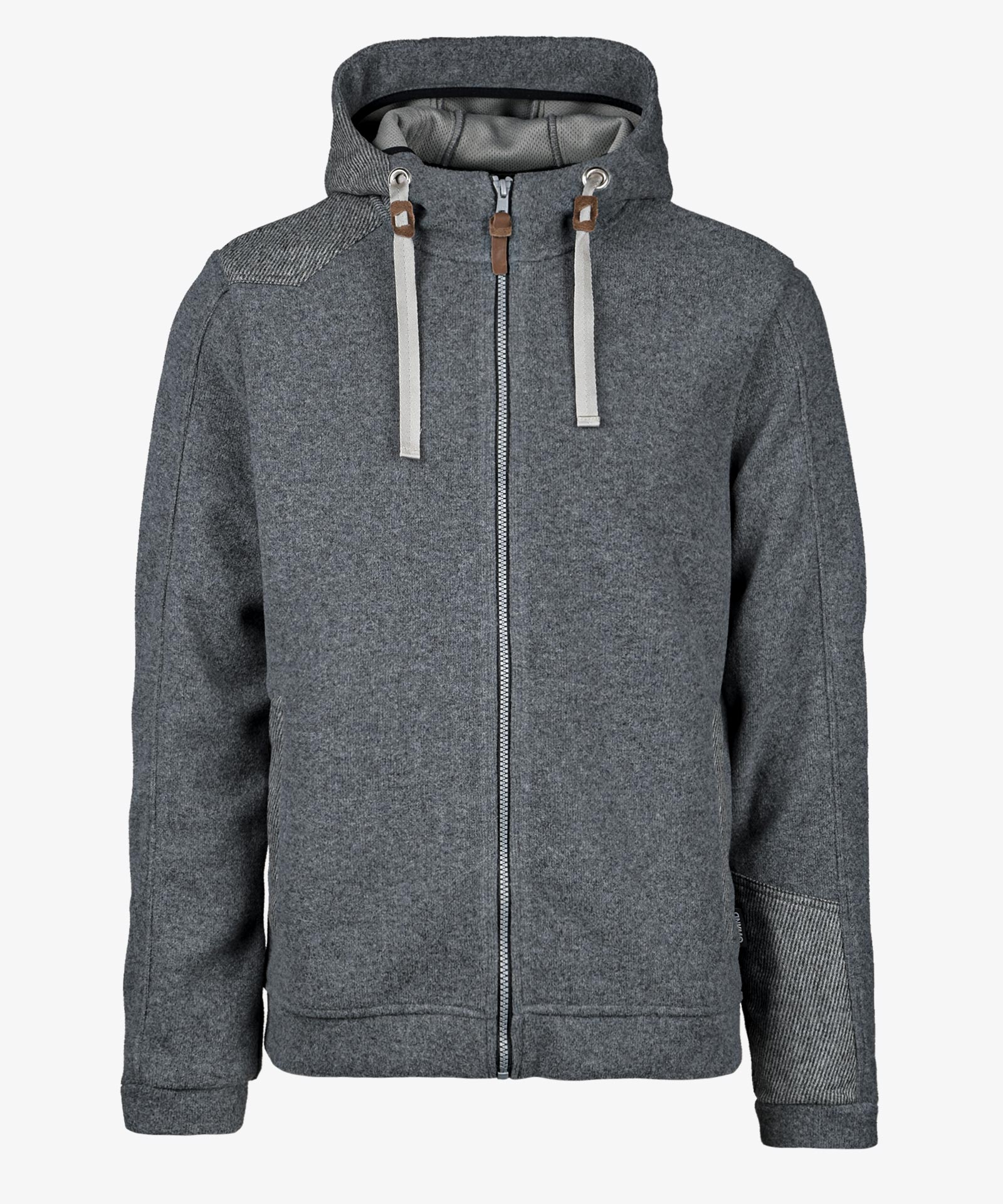 Walkjacke in Wollmischung, doppelseitiger Strick mit recyceltem Wollanteil an der Außenseite / Mesh-Struktur auf der Rückseite; Kontrasteinsätze in Schurwolle; seitlich verdeckte Taschenzippeingriffe; angeschnittene Kapuze mit Kordelband-Verstellmöglichkeit; abnehmbare Echtleder-Details an Frontzipp und Kapuze; ungefüttert