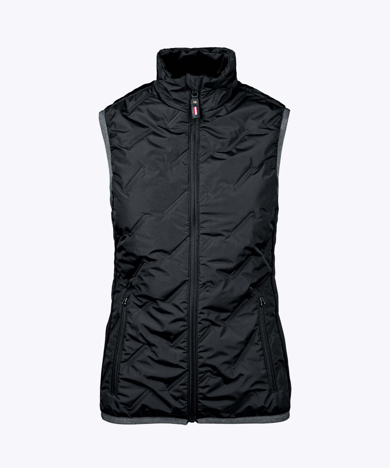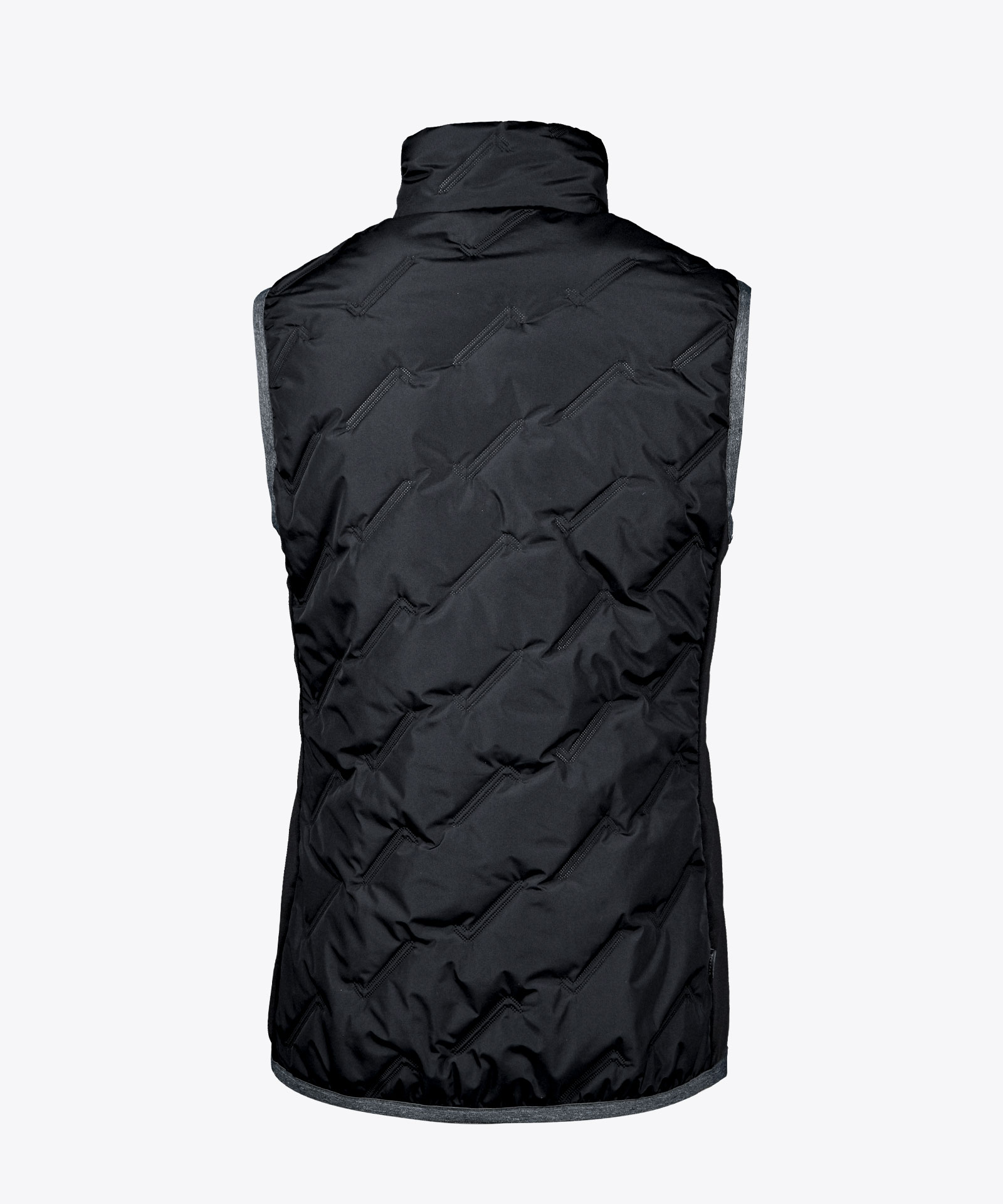 Leicht wattierte Weste mit Steppeffekt: geschweißte Kammerkonstruktion mit Isolation aus Kunstfaser; seitliches Kontrastmaterial in bi-elastischer Knitshell-Qualität für Bewegungsfreiheit; hochschließender Frontzippverschluss, Elastikeinfassung an Saum und Armabschluss; zwei Zipptaschen; ungefüttert