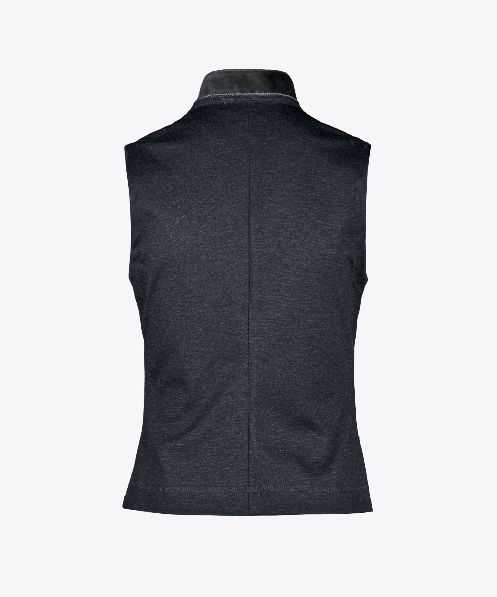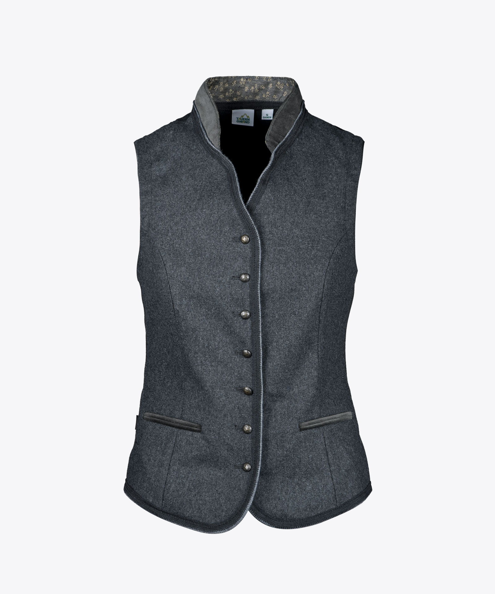 Traditionelle Optik mit Funktion durch Materialmix mit leicht elastischem, meliertem Lodenstoff am Vorderteil und hochelastischer Wirkware am Rücken; V-Ausschnitt; Samtstoff-Akzente an Stehkragen außen und Tascheneingriffen; Wollbandeinfassung entlang vorderer Kante und Halsnaht; Metallknopfverschluss; Vorderteil gefüttert