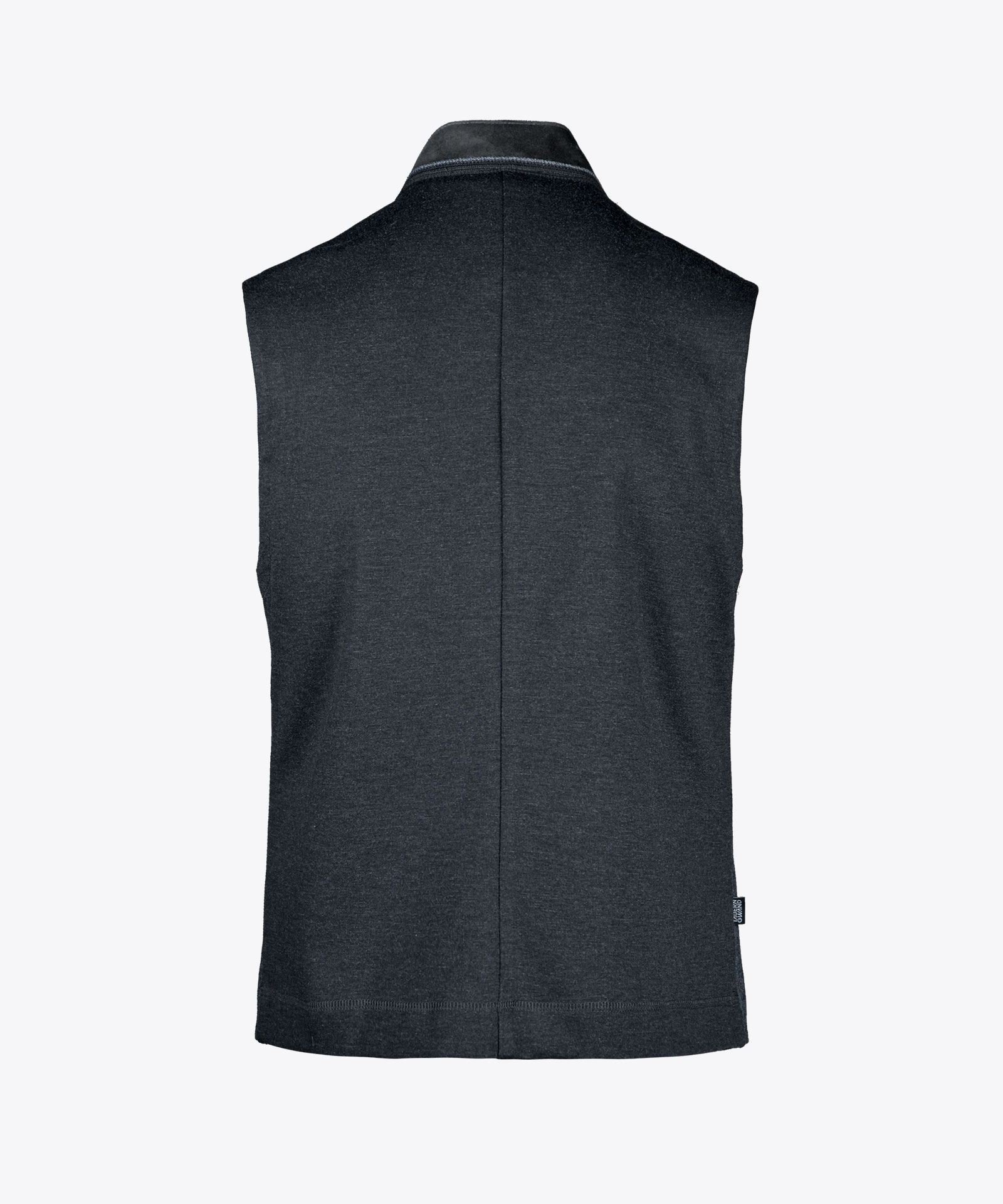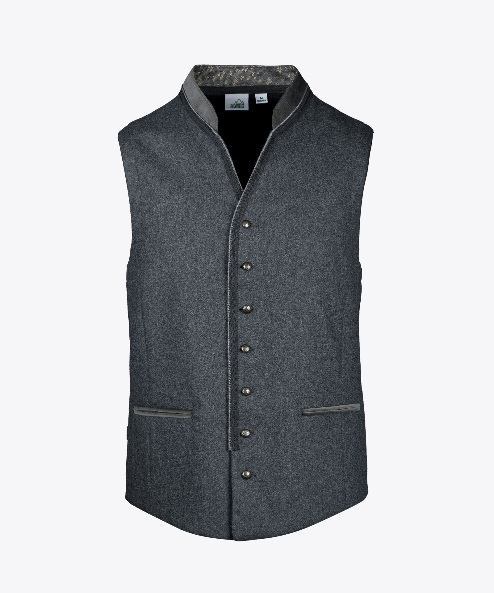 Traditionelle Optik mit Funktion durch Materialmix mit leicht elastischem, meliertem Lodenstoff am Vorderteil und hochelastischer Wirkware am Rücken; V-Ausschnitt; Samtstoff-Akzente an Stehkragen außen und Tascheneingriffen; Wollbandeinfassung entlang vorderer Kante und Halsnaht; Metallknopfverschluss; Vorderteil gefüttert