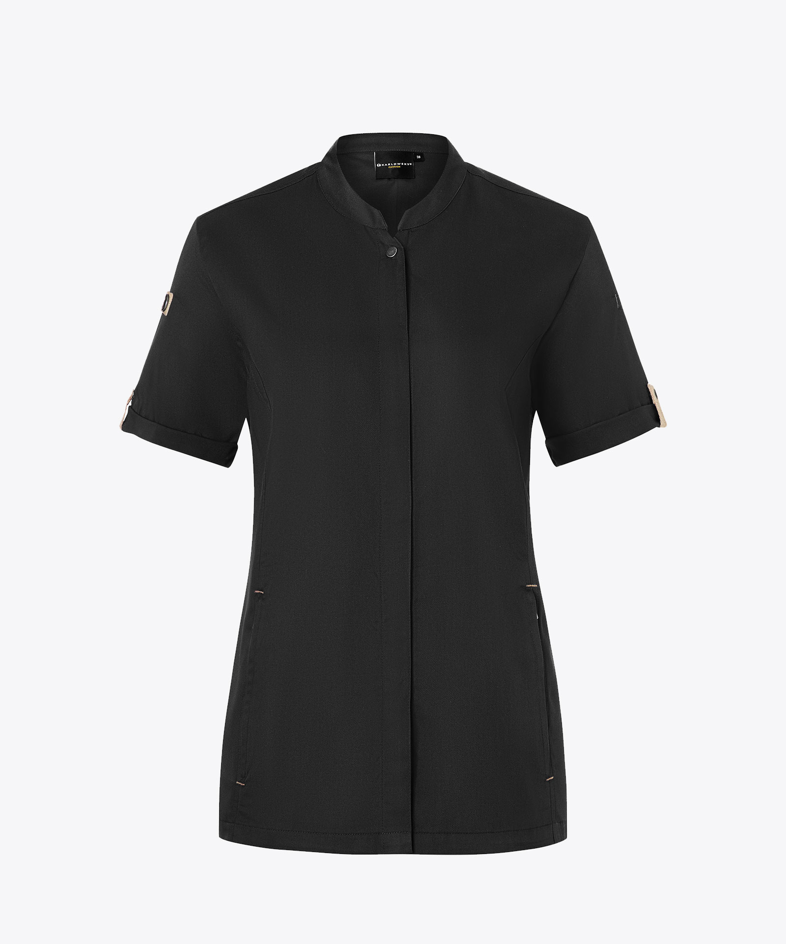 innovative nachhaltige Kochjacke für Damen mit kurzen Ärmeln, die urbanen Style mit natürlichem Flair verbindet