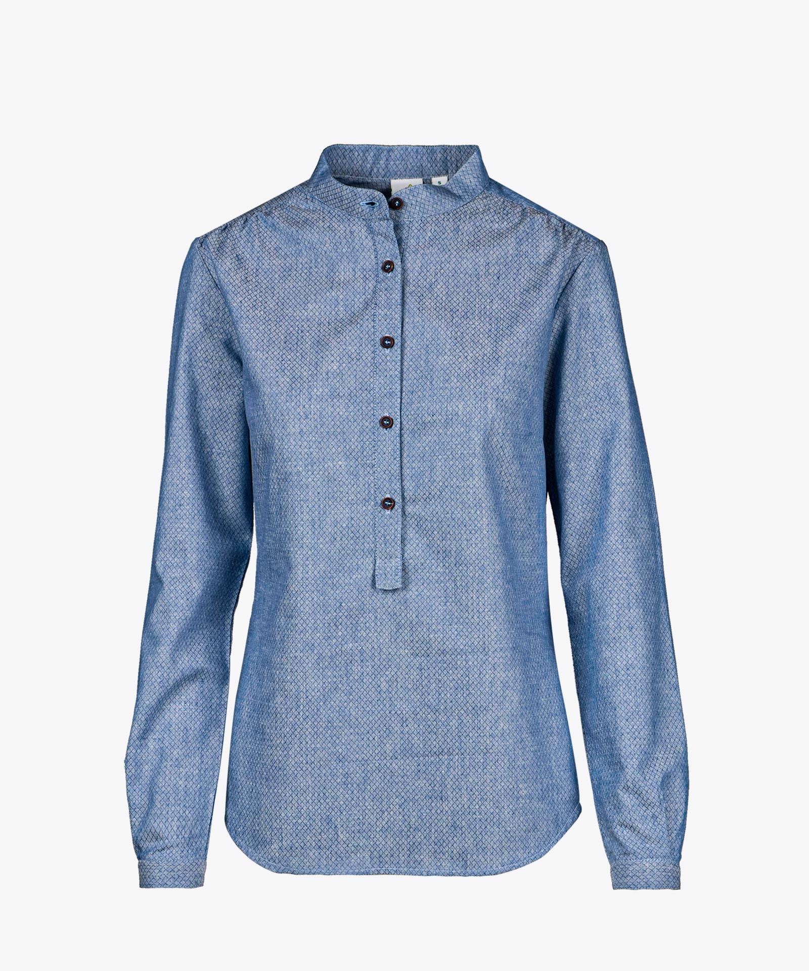 Hanffaser-Qualität in Rautendesign; verkürzte Knopfleiste; gerundeter Saumabschluss; Damen mit kurzem Seitennahtschlitz und leichter Raffung an Schulternaht; Stehkragen Material: 70% Baumwolle, 30% Hanf