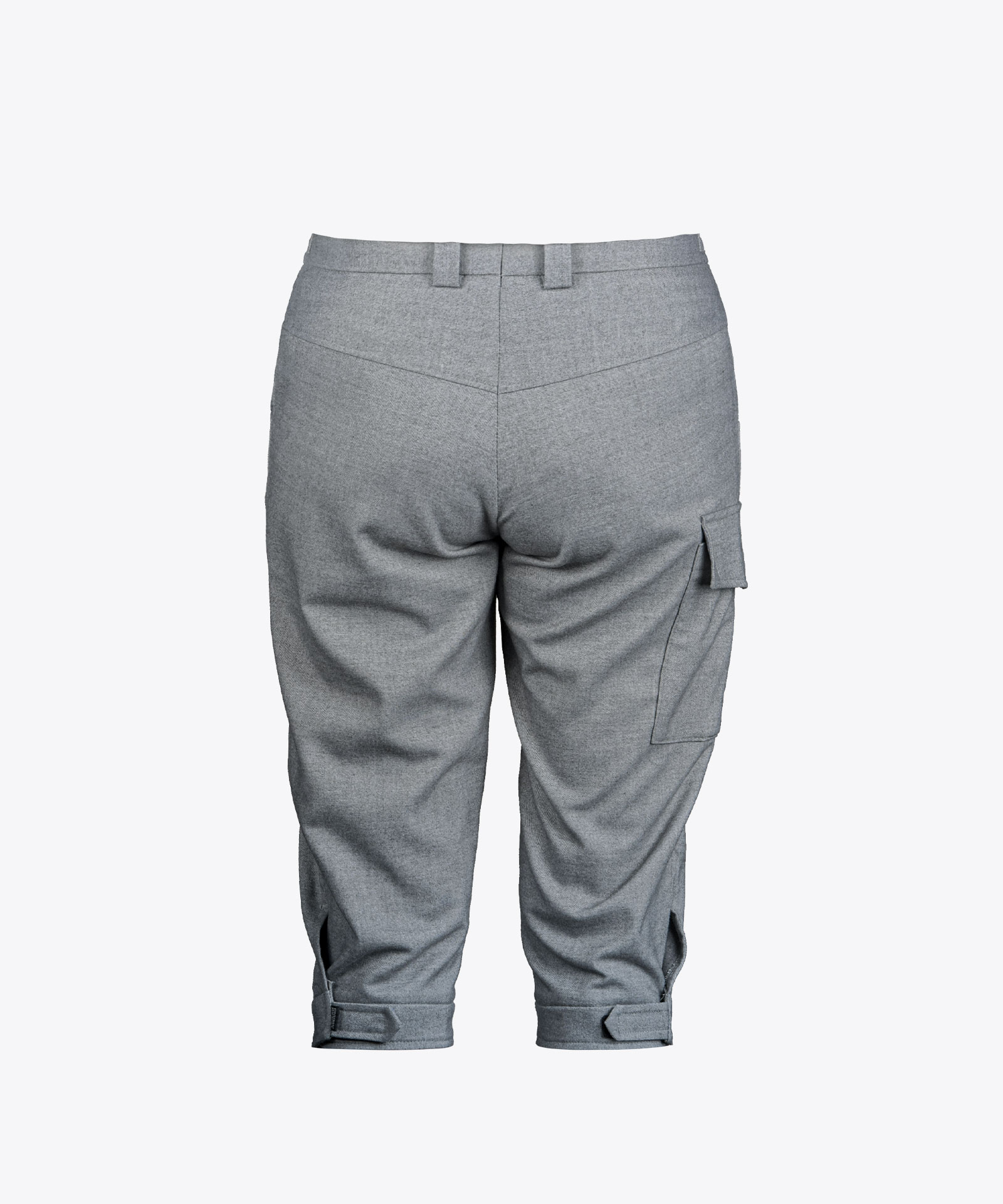 Kniebundhose in meliertem Twillstoff mit Lodencharakter; zwei seitliche Eingriffstaschen, eine rechte Beintasche; Bund und Saum zum Regulieren der Weite; Frontzipp; Gürtelschlaufen