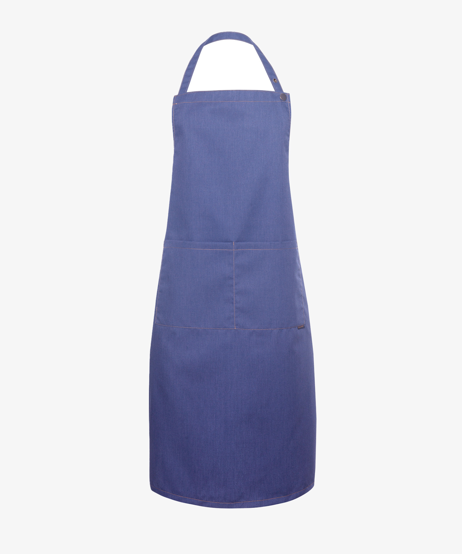 moderne Latzschürze in Jeans-Optik mit Bändern aus Schürzenstoff, kontrastfarbige Steppnähte für den originalen Jeans-Look, zusätzliche Strapazierfähigkeit durch Nahtverriegelung an den Schürzenbänder, Latzbandlänge einstellbar mit 3 Druckknöpfen, aufgesetzte Tasche (40 x 20 cm) mit 2 komfortablen Fächern (jeweils 20 x 20 cm), industriewäschetauglich