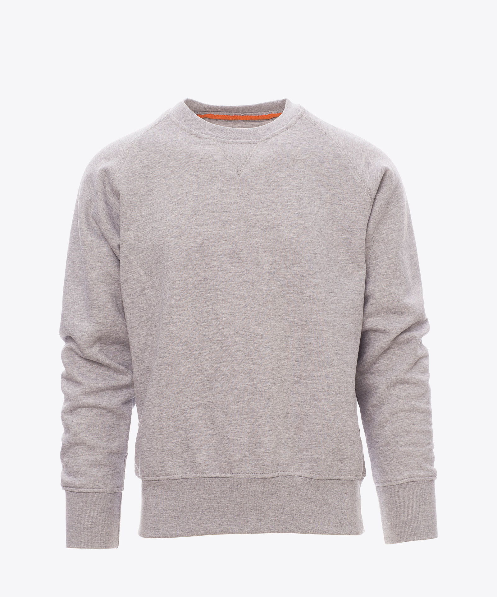 Sweatshirt mit Rundhalsausschnitt, Raglanärmeln, V-Ziernaht am Ausschnitt, elastischem Feinripp an Ärmeln und Taille, verstärkten Nähten. Material: 70% Baumwolle, 30% Polyester, Material Melange: 60% Baumwolle, 40% Polyester, Material Fluo: 50% Baumwolle, 50% Polyester,