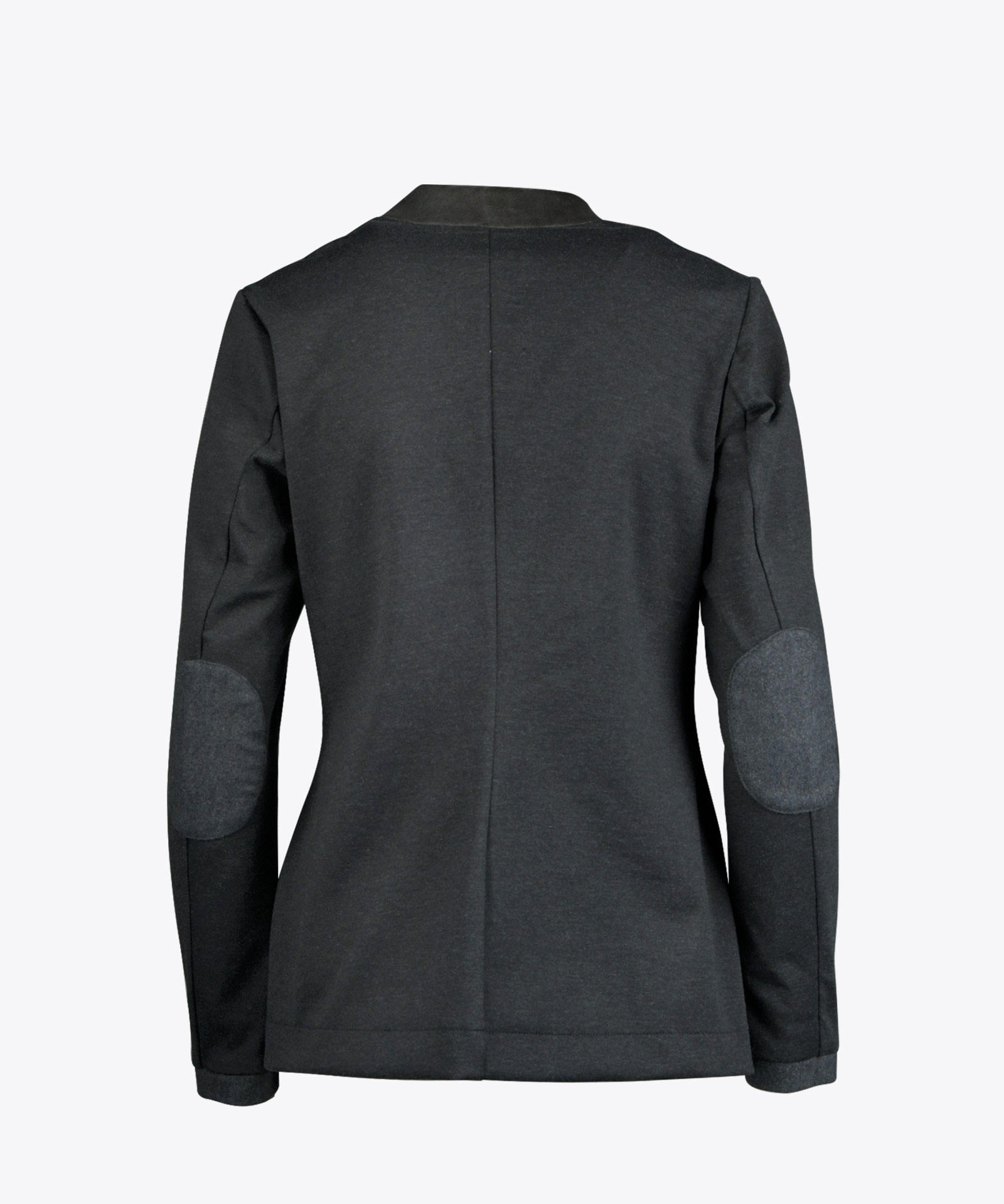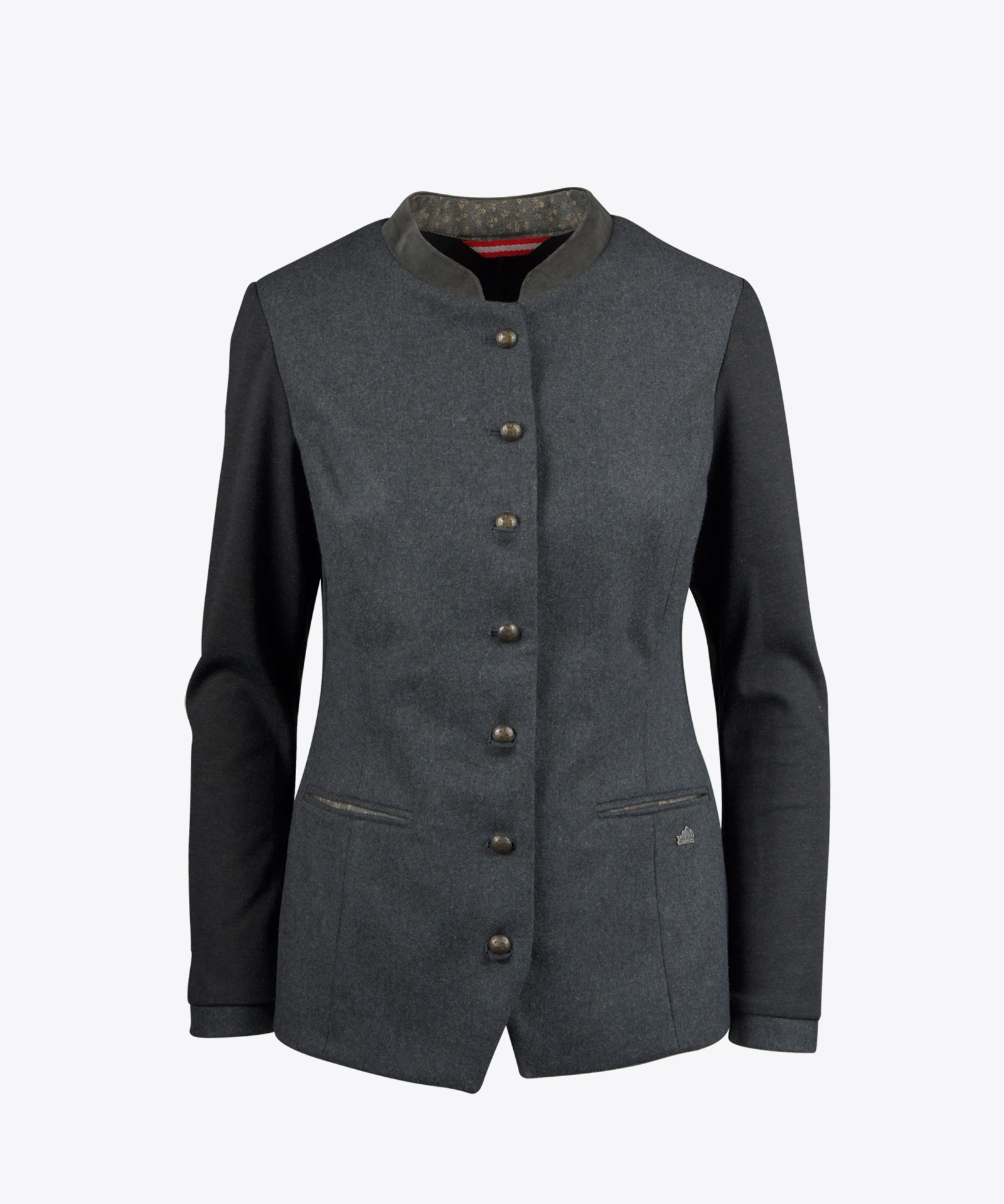 Hochgeschlossene Blazerjacke im Materialmix mit leicht elastischem meliertem Lodenstoff am Vorderteil und hochelastischer Wirkware an Rücken und Ärmeln; Samtstoff-Akzente an Stehkragen außen und Tascheneingriffen; Metallknopfverschluss; Vorderteil gefüttert