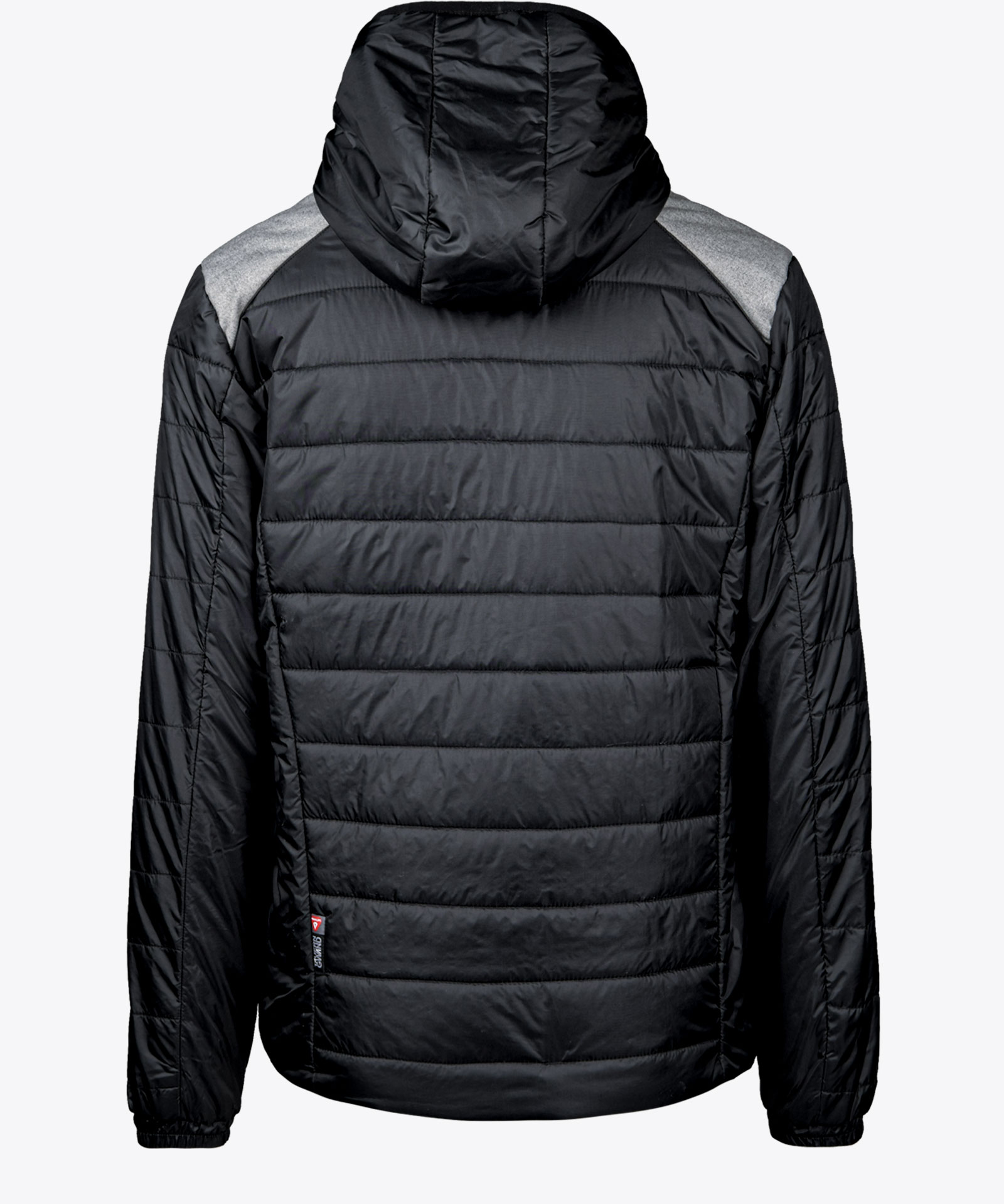 Steppjacke in leicht glänzender Oberfläche mit Flanellstoffbesätzen; zweifarbige Zipps an Frontverschluss und drei Außentaschen; zusätzliche Innenzipptasche; abnehmbare Kapuze; Ärmelabschluss mit Elastikbund; gefüttert; PrimaLoft® Isolierung 100 g