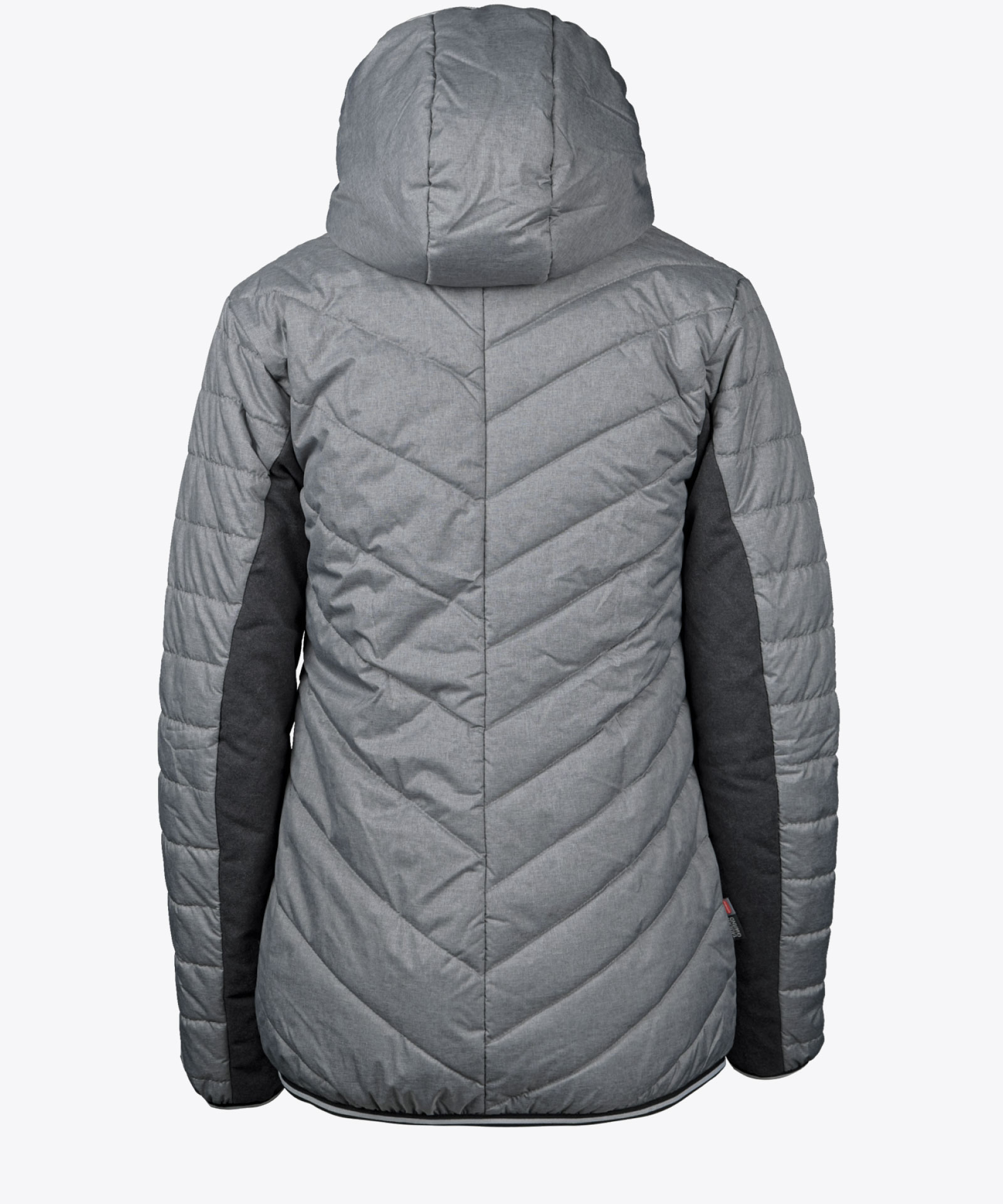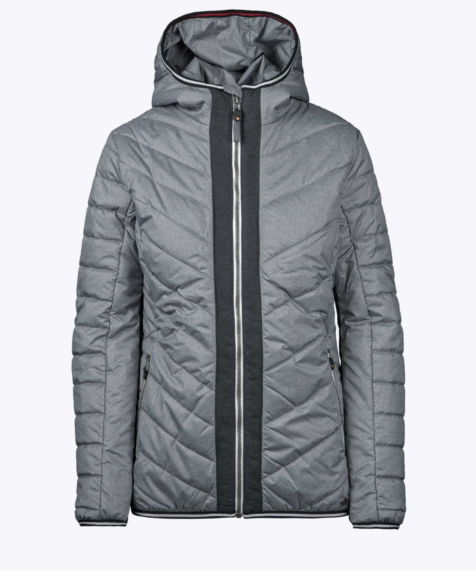 Modell in leicht glänzender Qualität mit asymmetrischem Steppdesign; Außenstoff wasserabweisend; Blende entlang Frontzipp in Woll-Look; Kontrastierung an Futterfarbe, Zipps und Elastikeinfassung für sportlichen Look; angeschnittene Kapuze; zwei Zipptaschen außen; Innenzipptasche; Echtleder-Zippangreifer; PrimaLoft® Isolierung 100 g; gefüttert