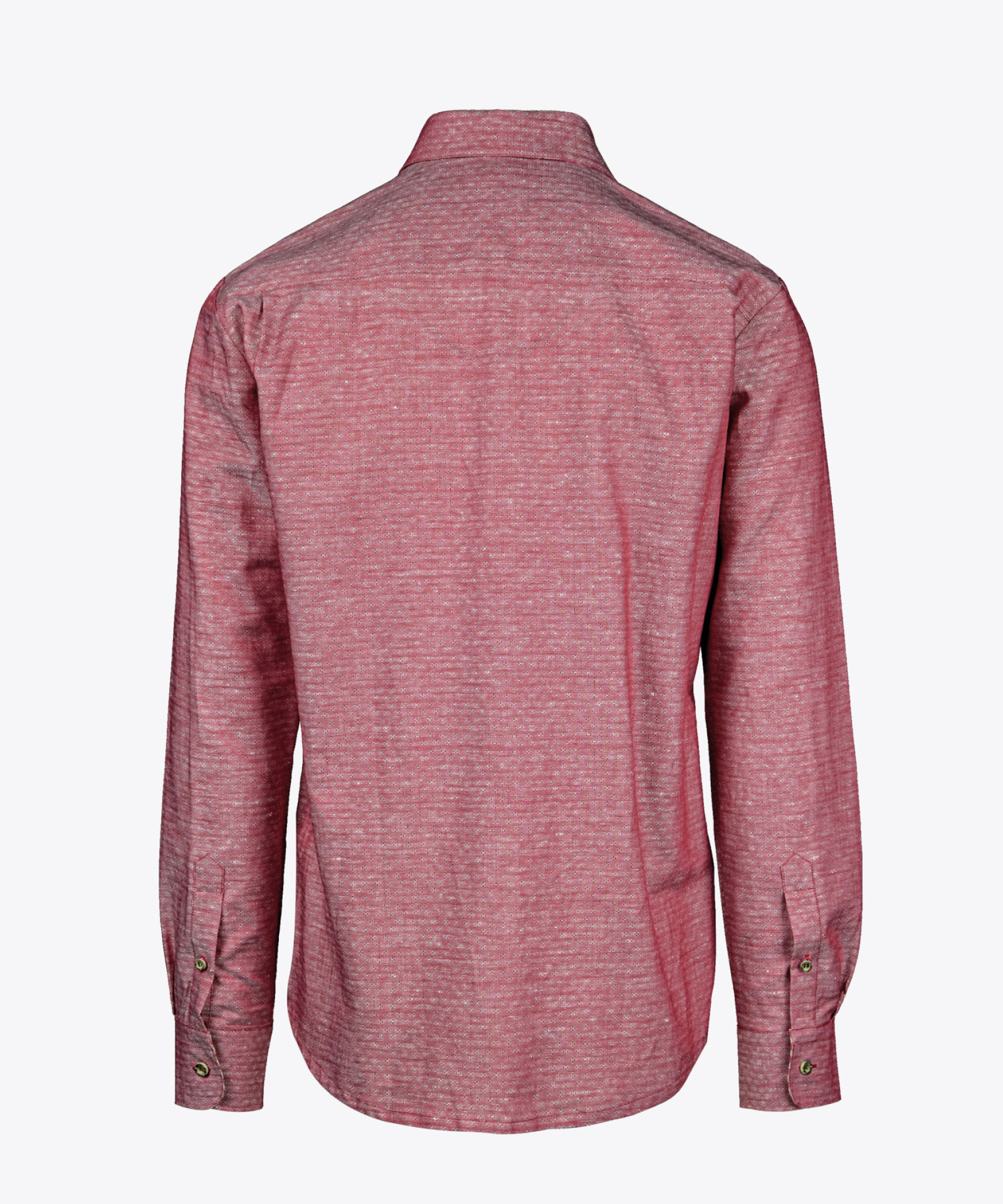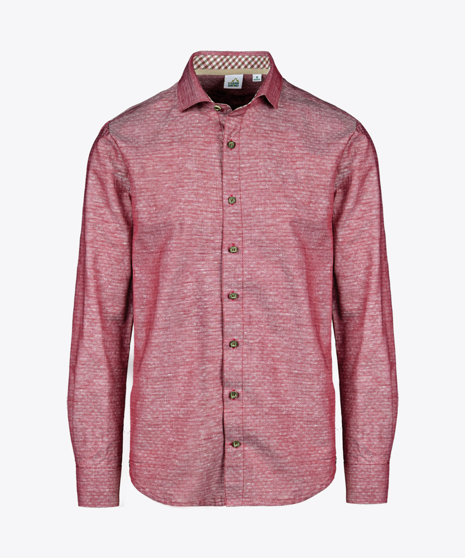 Jacquardstoff in charakteristisch unregelmäßiger Leinenstruktur; farbharmonische Karostoff-Akzente; Knöpfe in Hirschhorn-Optik; gerundeter Saumabschluss; Damen mit kurzem Seitennahtschlitz; Haifischkragen