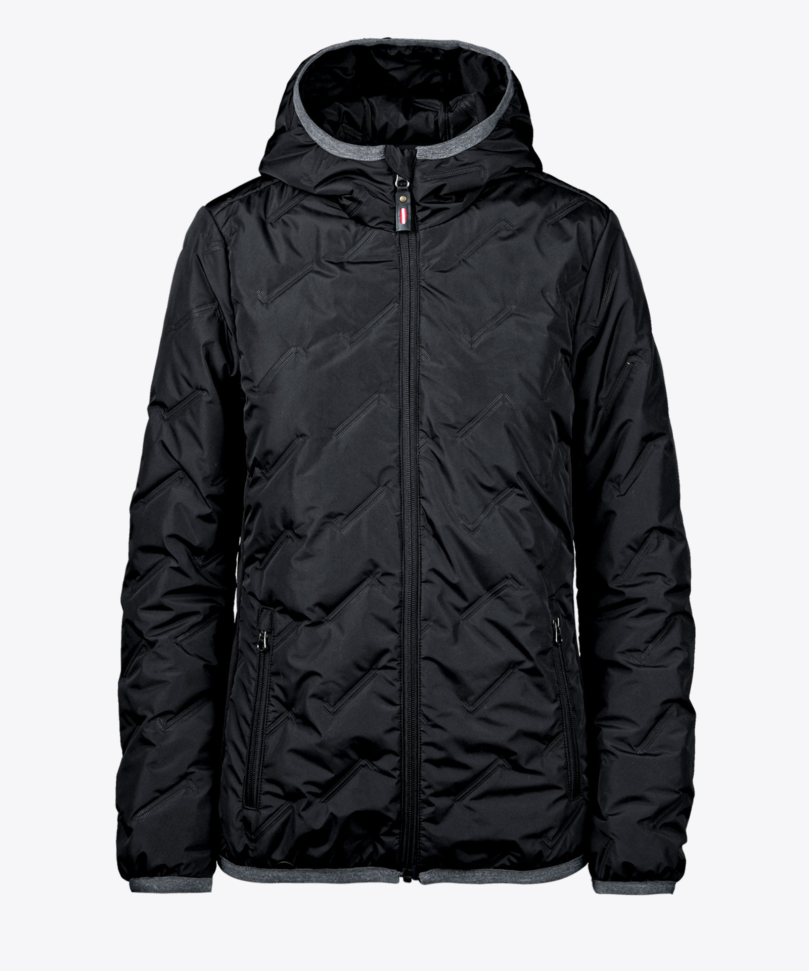 Leicht wattierte Jacke mit Steppeffekt; geschweißte Kammerkonstruktion mit Isolation aus Kunstfaser; seitliches Kontrastmaterial in bi-elastischer Knitshell-Qualität für Bewegungsfreiheit; angeschnittene Kapuze; Elastikeinfassung an Saum, Ärmelabschluss und an der Kapuzenöffnung; zwei Zipptaschen