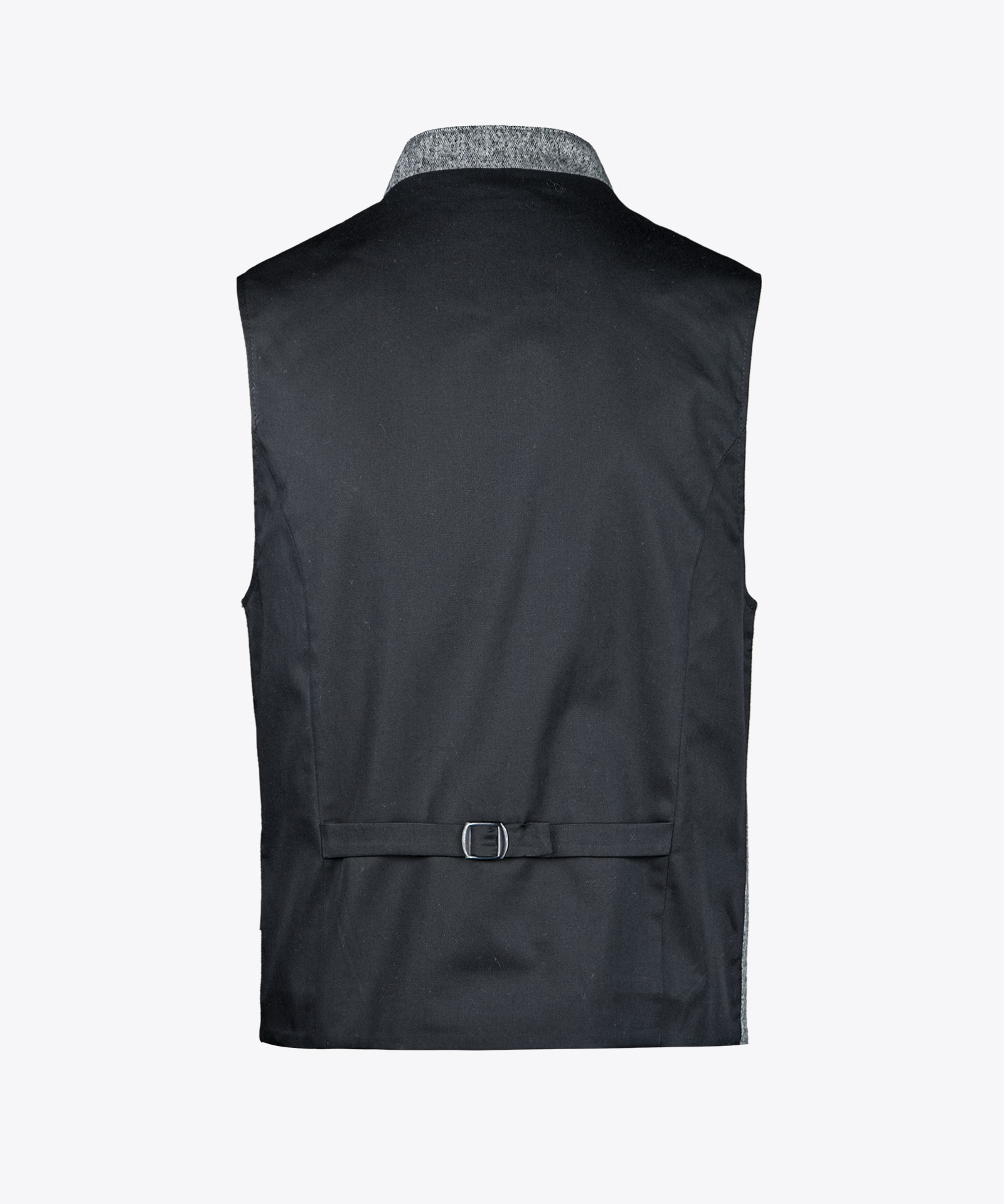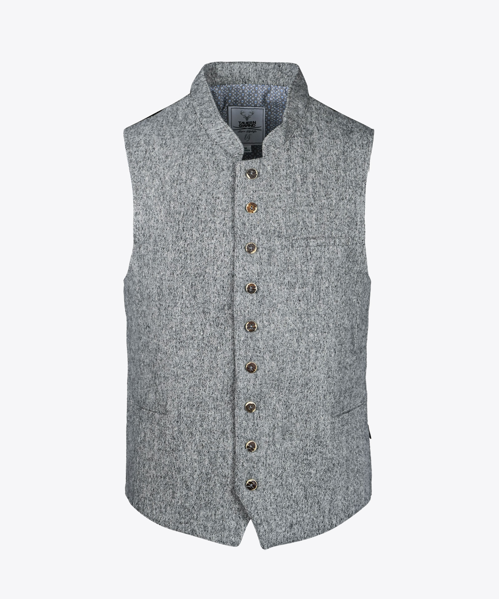 Wollgilet aus Schladminger Lodenstoff; kleiner Stehkragen; Rückenteil aus schwarzem Baumwollstoff und mit verstellbarem Rückenriegel; Beinknöpfe in Hirschhorn-Optik; zwei Leisteneingriffstaschen; Herren mit Brusttasche am linken Vorderteil; Innenfutter bedruckt