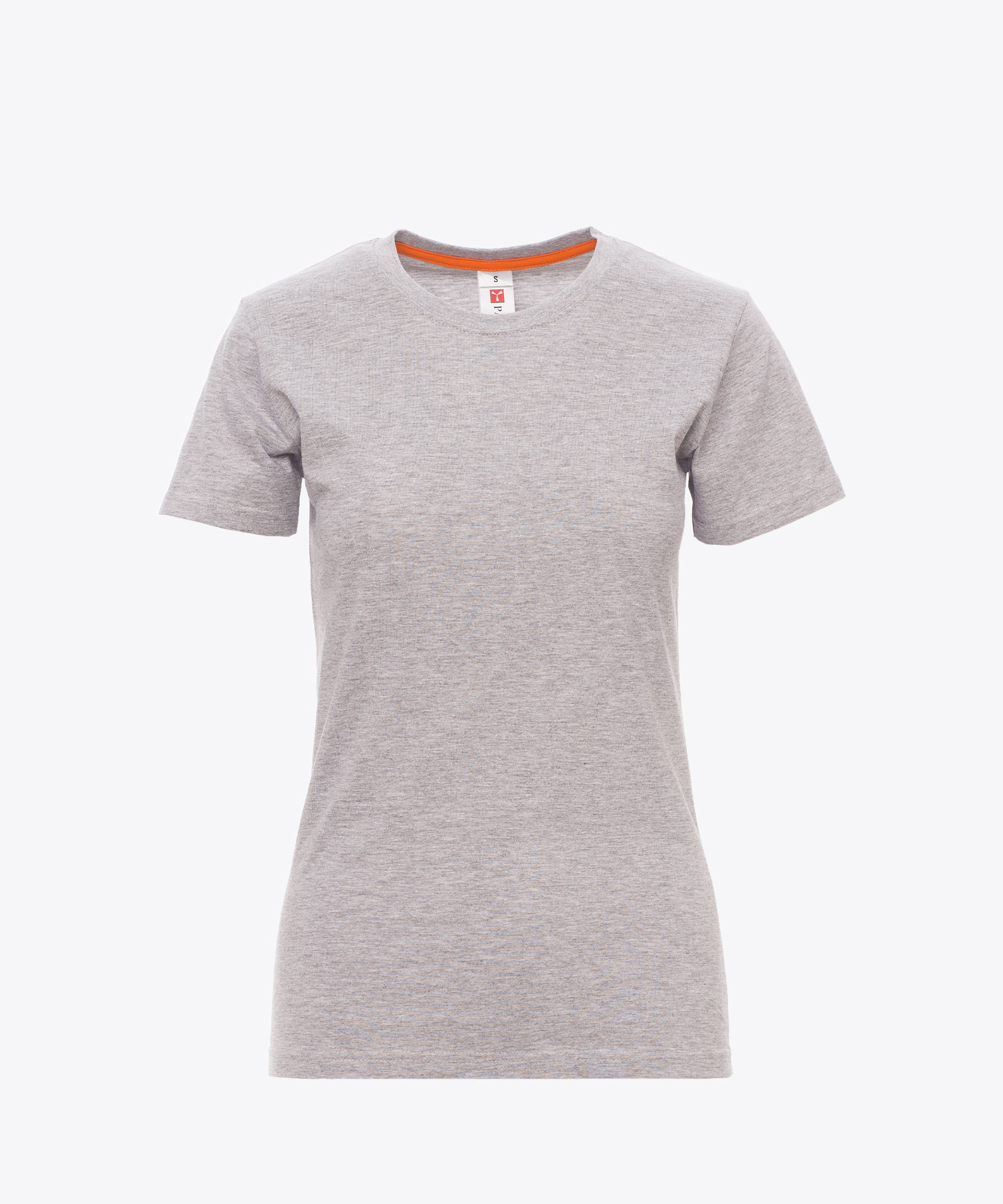 Tailliertes Damen-T-Shirt mit Rundhalsausschnitt, kurzärmelig, Feinripp Kragen 1,5 cm aus Spandex-Mischgewebe mit Kappnaht an der Vorderseite, Verstärkungsband in Kontrastfarbe von Schulter zu Schulter, das im Kragensichtbar ist, Stretchnähten, Seitennaht