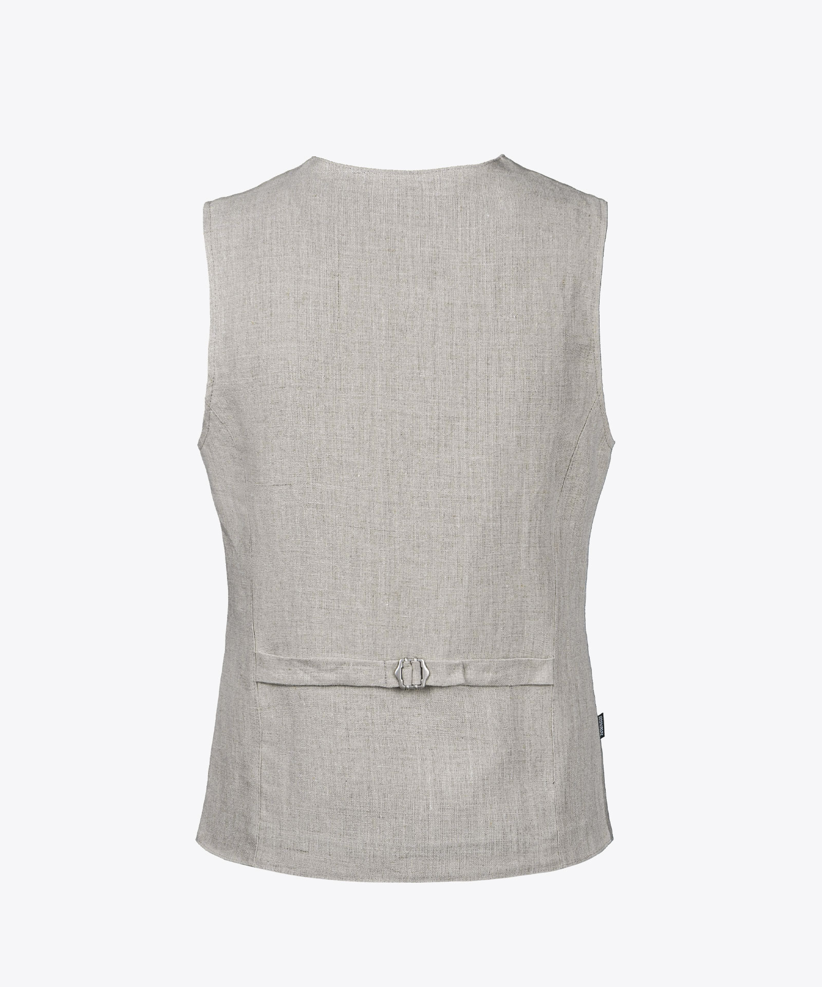 Hochgeschlossene Leinenweste mit Druckdesign am Vorderteil, stoffgleicher Rücken uni mit Riegel zum Verstellen der Weite; Karostofffutter innen