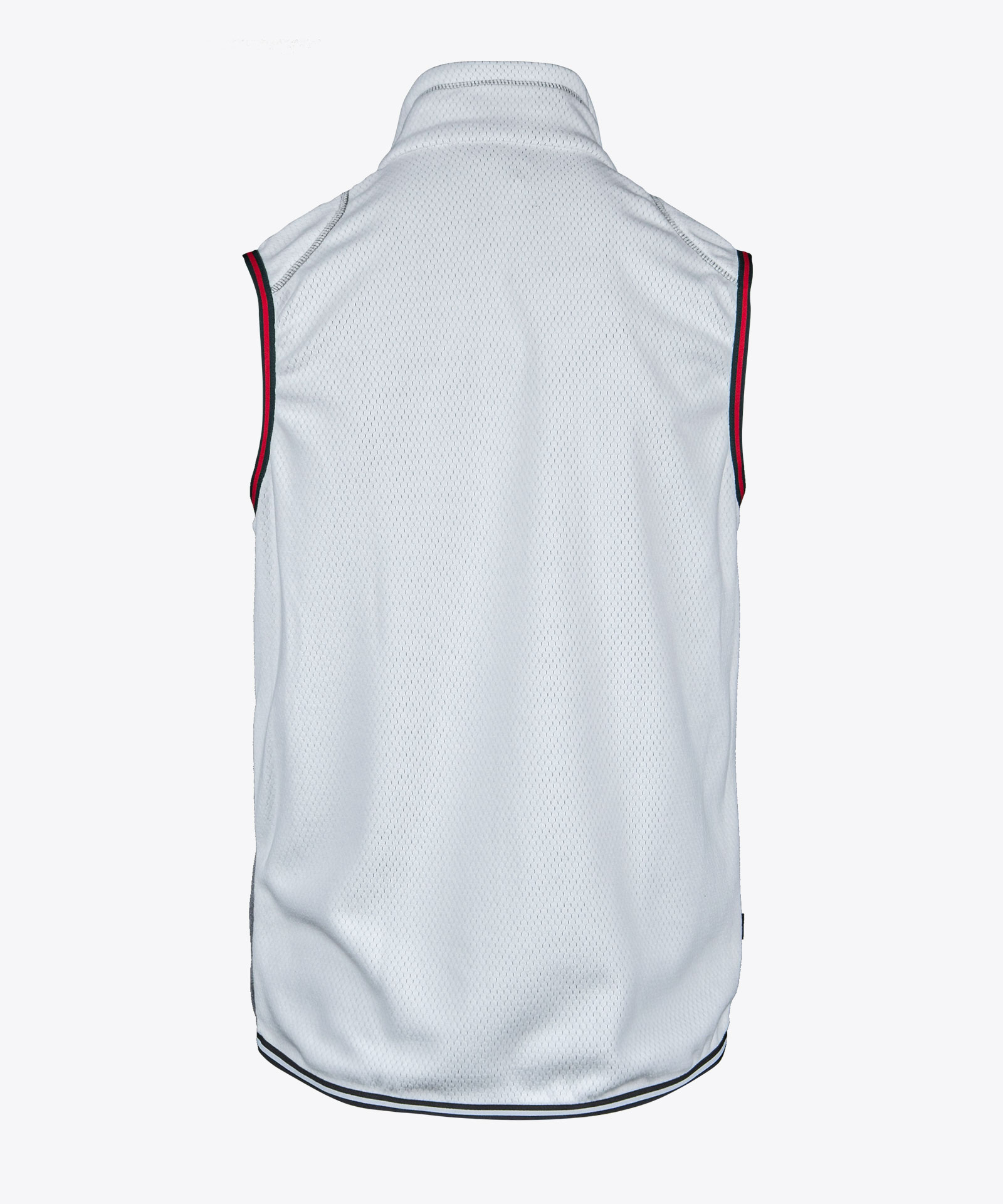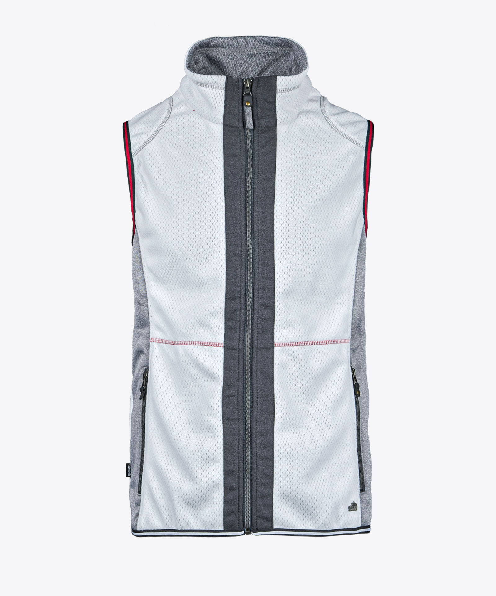 Fleeceweste in Wabenstruktur an der aufgerauten Fleeceinnenseite; elastisches Knitshell-Material an den Seiteneinsätzen in Melange; Blende entlang Frontzipp in Woll-Look; hochgeschlossener Kragen; Kontrastierung an Zipps und Elastikeinfassung an Saum und Armabschluss; zwei Zipptaschen; Echtleder-Zippangreifer